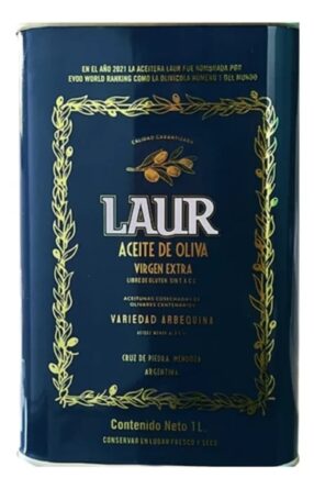 Lata Laur Virgen Extra de 1L contiene nuestro aceite Clásico Virgen Extra 100% Arbequina, selección especial, que da un aroma frutado verde intenso con notas de hierba recién cortada.